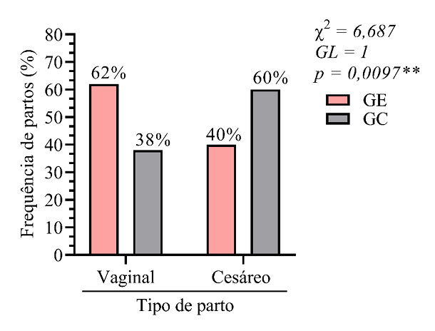 Os resultados apresentados na Figura I mostram que o protocolo utilizado foi eficiente para o aumento dos partos vaginais, já que a tendência obtida nas frequências observadas mostrou que o GE apresentou maior número de partos vaginais e menor número de partos cesáreos comparados ao grupo controle (GC).