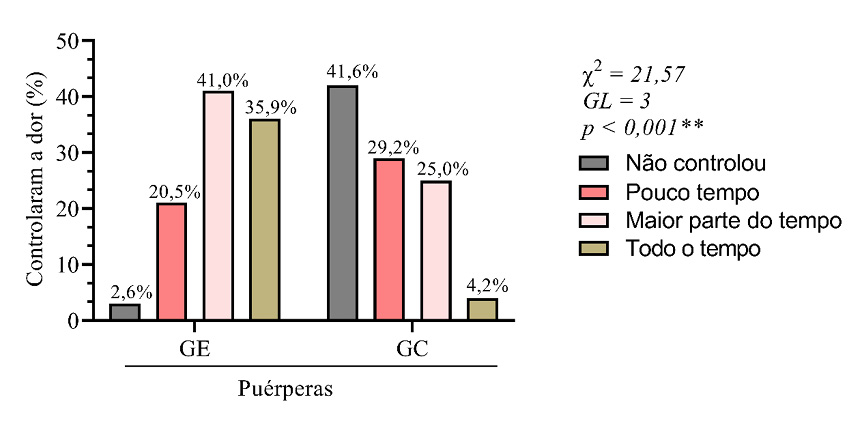 Os resultados apresentados na Figura II mostram que o protocolo avaliado (GE) teve resposta significava no controle da dor, em que pacientes que se submeteram ao PPV tenderam a controlar as dores do parto, fato inversamente observado nas pacientes do grupo controle (GC), que não controlaram ou controlaram pouco as dores do parto.