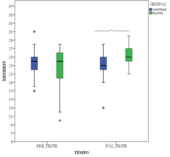 Os resultados referentes à análise do equilíbrio, mensurado através do Mini-BESTest, mostraram que houve melhora significativa no grupo Pilates em sua análise pré e pós teste, bem como na medida entre os grupos Pilates e Controle. Além disso, o Grupo Pilates apresentou resultados significativamente superior em sua pontuação (tabela 3 e gráfico 1).