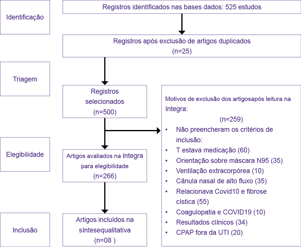 De acordo com a estratégia de busca da pesquisa, foram identificados 524 artigos relativos aos pacientes COVID-19 na UTI em VNI. Desse total, 262 artigos foram selecionados para revisão completa do texto e 08 artigos atenderam aos critérios de inclusão e foram incluídos na síntese final da revisão sistemática. A seleção dos estudos foi descrita na Figura 1.