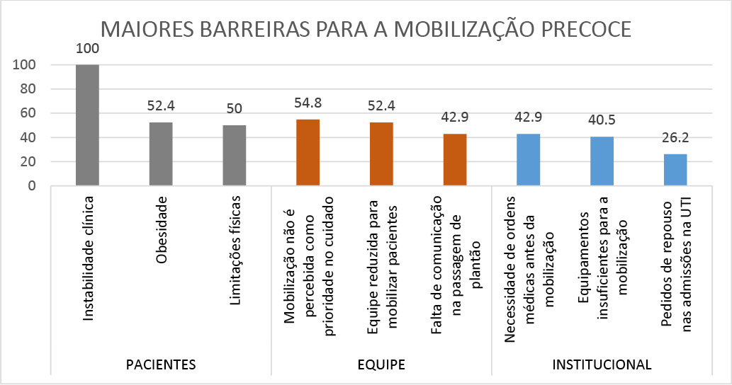 As principais barreiras para a mobilização precoce, segundo a percepção dos profissionais deste estudo, foram a instabilidade clínica, a falta de equipamentos da instituição e a falta de prioridade para mobilização, sendo, de forma geral, a instabilidade clínica a barreira mais limitante, caracterizada por uma barreira não modificável. Entretanto, as demais barreiras identificadas relacionadas com a instituição e com a equipe são classificadas como modificáveis, portanto dependem da equipe e da própria instituição para serem superadas. Logo, a partir destes dados, sugere-se estratégias como mais treinamento das equipes de saúde e a existência de um protocolo institucional acessível capaz de integrar toda a equipe em relação aos prós e contras da conduta em questão, constituindo, assim, formas de reduzir as barreiras modificáveis identificadas neste estudo, deixando mais evidente a prática de mobilização precoce dentro da UTI.