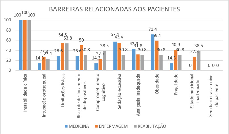 A Figura 1 a seguir apresenta os resultados obtidos sobre a percepção da equipe em relação as maiores barreiras relacionadas ao paciente, equipe e instituição, bem como os resultados com maior frequência de respostas. A barreira prevalente, apontada de forma unânime pelos participantes da pesquisa, foi a instabilidade clínica relacionada ao paciente.