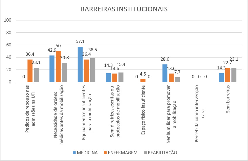A Figura 3 a seguir apresenta os resultados sobre as barreiras relacionadas à instituição (HU-UFPI). Como destaque, citam-se a falta de equipamentos suficientes e a necessidade de ordens médicas para iniciar a mobilização. Não houve diferença estatística sobre a percepção das barreiras relacionadas à instituição entre os profissionais pesquisados.
