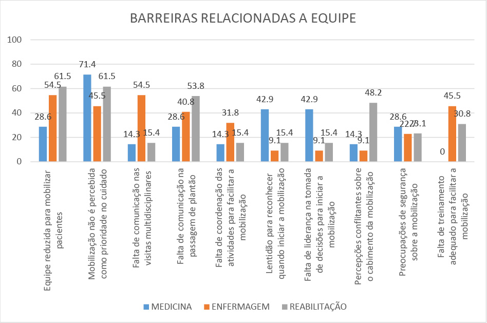Ao serem questionados sobre o responsável pela execução da mobilização precoce, todas as categorias afirmaram que o responsável pela conduta é o fisioterapeuta, com apoio da equipe multiprofissional. As principais barreiras para a mobilização precoce identificadas segundo a percepção da equipe foram: relacionadas ao paciente, especificamente a instabilidade clínica; relacionadas à instituição, destacando-se a falta de equipamentos para a execução da mobilização e às relacionadas com a equipe, onde a mobilização não foi vista como prioridade no cuidado.