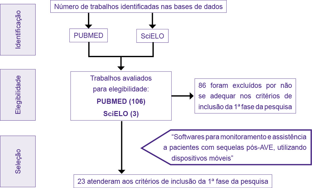Na primeira fase da pesquisa, esquematizada no Fluxograma 1, foi realizada uma revisão sistemática nas bases de dados Public Medline (PUBMED) e Scientific Electronic Library Online (SCIELO). Foram utilizados os descritores “Acidente Vascular Encefálico”, “Aplicativo* Móvei*”, “Programa*” e seus respectivos correspondentes em inglês (Stroke, Mobile Application* e Program*).