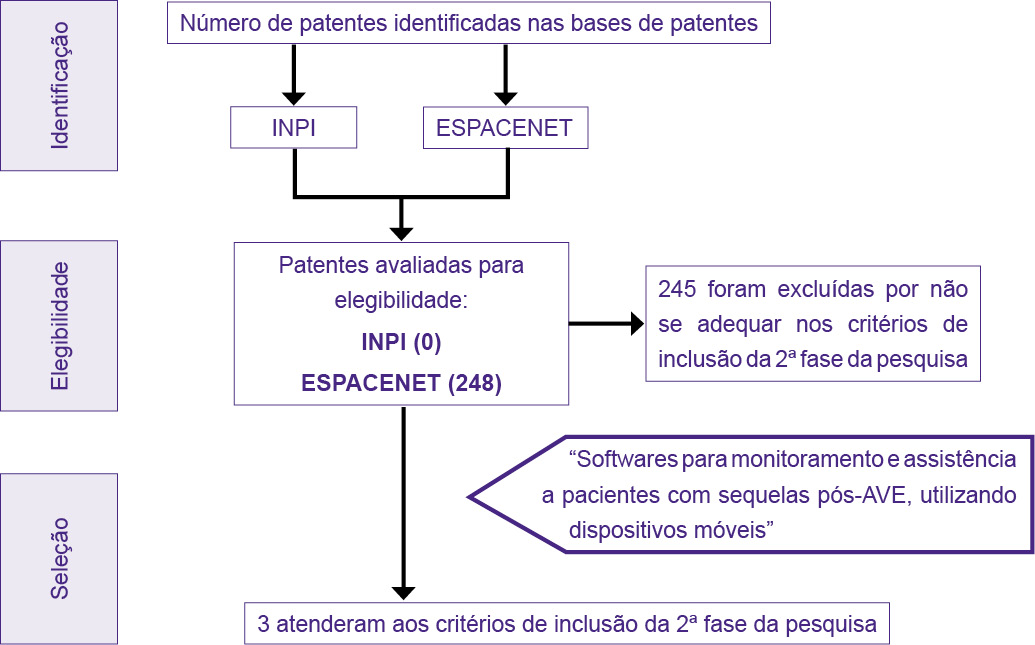 Na segunda fase da pesquisa, esquematizada no Fluxograma 2, a busca foi realizada na base de patentes nacional do Brasil – Instituto Nacional da Propriedade Industrial (INPI) – e na base de patentes internacional ESPACENET, uma base de dados do Escritório Europeu de Patentes (EPO), que possui mais de 120 milhões de documentos de escritórios de patentes governamentais pertencentes a mais de 100 países. Foram utilizados os descritores “Acidente Vascular Encefálico” e “Aplicativo Móvei” e seus respectivos correspondentes em inglês (Stroke e Mobile Application*) – o descritor “programa” não foi utilizado nesta fase, focando em sistemas operacionais de dispositivos móveis.