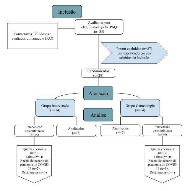 Foram contatados 100 idosos verificando se os mesmos apresentavam interesse em participar do estudo, dentre esses, 55 indivíduos foram avaliados por meio do IPAQ, desses ainda foram incluídos 28 pacientes após a verificação dos critérios de inclusão e exclusão deste ensaio. Após a randomização 14 foram alocados para o grupo intervenção (GI) e 16 foram alocados para o grupo gameterapia (GG).