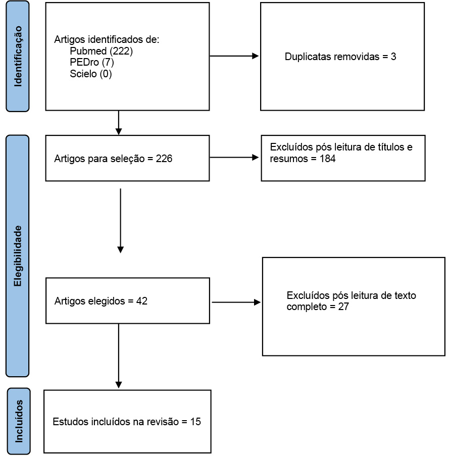 Com a aplicação da estratégia de busca nas bases de dados PubMed, PEDro e Scielo, foram encontrados 222 artigos na Pubmed, 7 na PeDro e 0 na Scielo, totalizando 229 artigos, restando 226 após exclusão das duplicadas. Após leitura de títulos e resumos, 184 foram excluídos por não apresentarem critérios de inclusão, restando 42 artigos eleitos para leitura do texto completo, dos quais 27 foram excluídos com bases nos critérios de exclusão, sendo 15 incluídos para análise e extração de dados (figura 1).