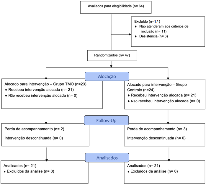 Randomizados em dois grupos: Grupo TMO, que recebeu a intervenção, e G2, que não recebeu. Todos os participantes dos dois grupos concluíram o estudo sem perda de acompanhamento ou descontinuidade.