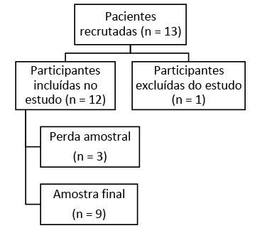 A amostra do estudo foi constituída por 9 indivíduos do sexo feminino com diagnóstico de CA de mama. Foi excluída do estudo uma paciente por ultrapassar o tempo de 48h após o término da RT. Houve uma perda amostral de três pacientes por motivo de desistência da participação na pesquisa, por dificuldade de acesso ao local de coletas e por desejo do paciente de interromper o tratamento. A inclusão de participantes se deu conforme fluxograma apresentado na Figura 1.