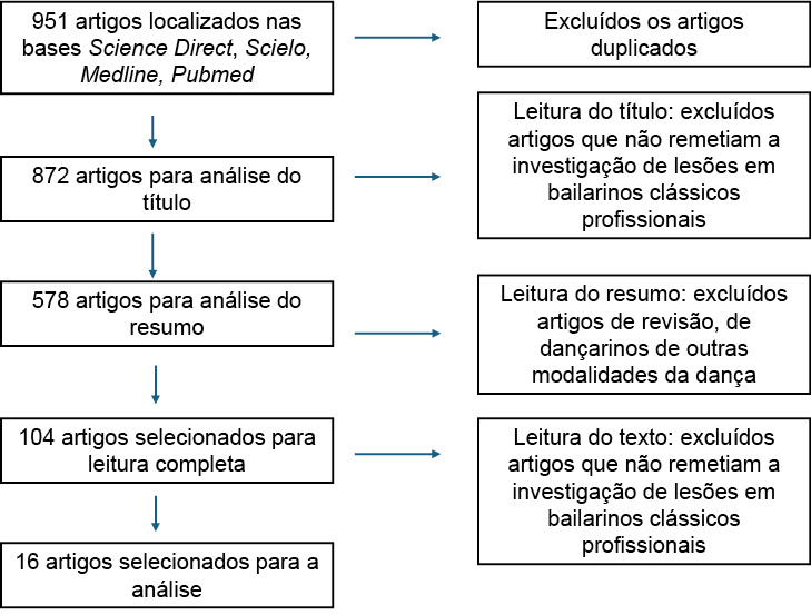 Para o desenvolvimento do presente estudo, foi realizada uma revisão sistematizada da literatura, para isso, foi realizada busca de artigos publicados nas línguas inglesa e portuguesa, indexados nas bases de dados: Science Direct, Scielo, Medline, Pubmed. Os termos utilizados para a busca dos artigos, de acordo com os descritores em Ciências da Saúde (DeCS), foram: injuries, dancing, ballet, physical therapy, lesões, dança, balé e fisioterapia. Os indicadores lógicos and e or foram utilizados entre os termos. Não foi inserido limite de data de publicação. Diante desses critérios, foram encontrados para a análise e discussão 31 artigos. Destes, foram excluídos os artigos de revisão, e estudos em que a amostra não era composta por bailarinos profissionais, sendo selecionados para a revisão sistemática 16 artigos, conforme ilustra a Figura 1, os quais abordam investigações através de pesquisas transversais ou longitudinais sobre a incidência de lesões em bailarinos e seus fatores associados.