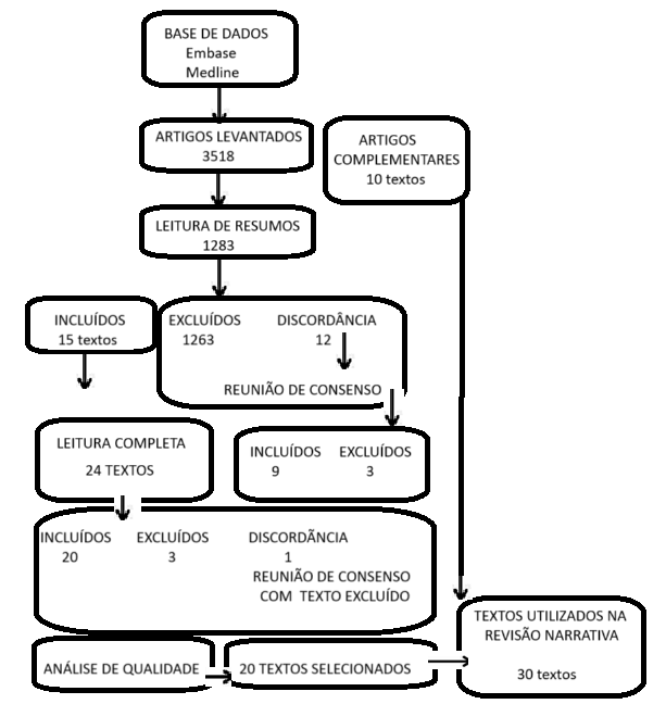 A busca resultou em 3.518 artigos e foram selecionados 20 artigos. Como se trata de revisão narrativa, permitiu-se a inclusão de 10 textos obtidos por meio de busca nas referências nos artigos levantados e livros.
