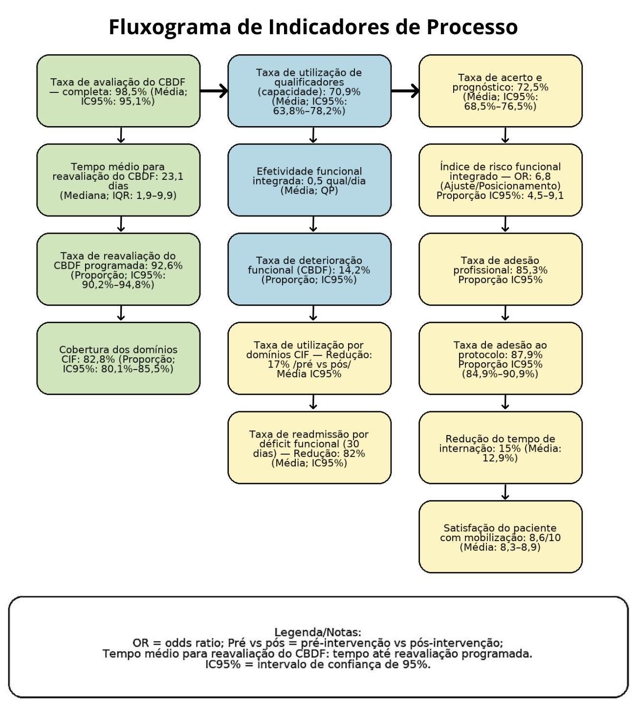 Indicadores institucionais como Taxa de Adoção Profissional e Tempo de Capacitação Efetiva não possuem correspondência funcional direta com os domínios CIF, sendo considerados elementos de gestão e não de avaliação funcional. No entanto, a Taxa de Aderência ao Protocolo e a Redução de Tempo de Internação demonstram relação indireta com a Efetividade Funcional Integrada CIF, pois refletem impacto clínico decorrente da aplicação sistemática dos protocolos de reabilitação.