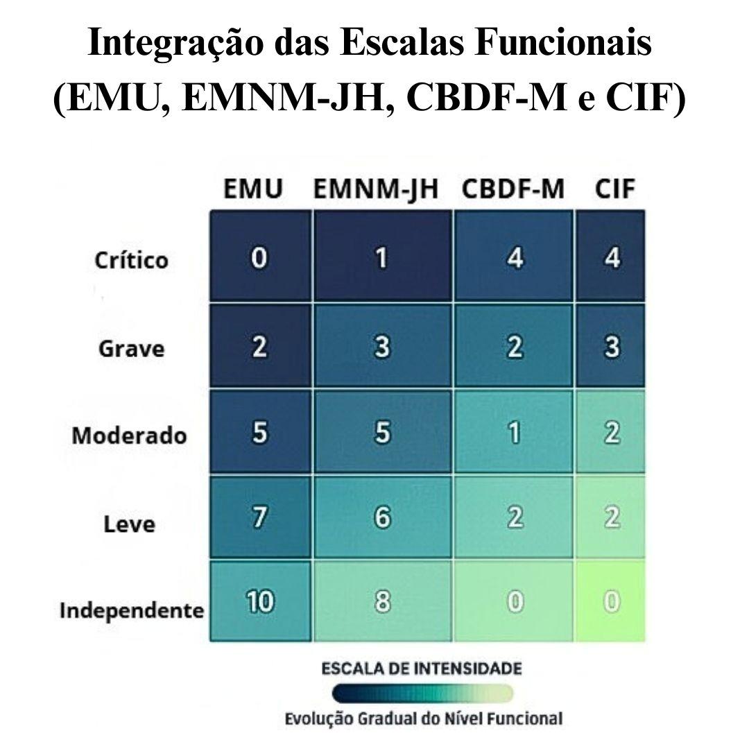 Para a EMU, obtiveram-se 18 correspondências CBDF-M com cobertura de 85,7%, com correspondências diretas para transferências (M01), posições básicas (M02) e locomoção básica (M04). A progressão hierárquica da EMU demonstrou compatibilidade conceitual excelente com a estrutura diagnóstica da CBDF-M, particularmente nos níveis intermediários (EMU 3-7), que correspondem à transição entre controle postural e mobilidade funcional.