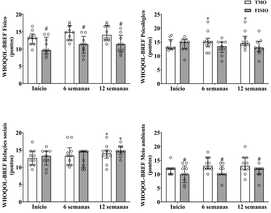 Figura 4 - Avaliação de qualidade de vida por meio do questionário WHOQOL-BREF. * P < 0,05 quando comparado ao Início; # P < 0,05 quando comparado ao grupo TMO; Tratamento Manipulativo Osteopático (TMO); Fisioterapia (FISIO); Círculos representam valores individuais. Barras são valores medianos e os desvios a amplitude interquartil (1º-3º quartil dos dados).