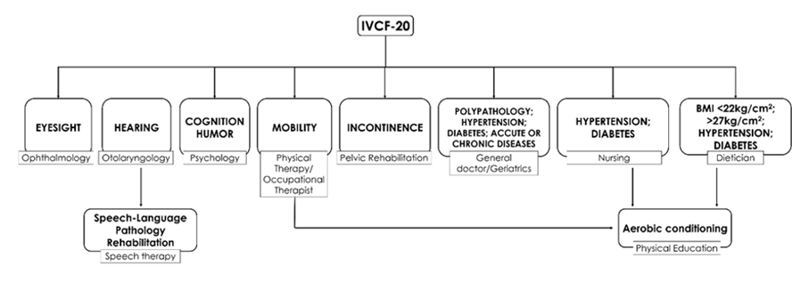 The purpose of applying the IVCF-20 to the elderly is to identify the specific dimension that contributes to increased vulnerability. The identification of this dimension leads to an individual treatment plan that includes different professionals. Figure 2 demonstrates a proposal of how the dimensions are connected to health areas. For example, an elderly person with impaired mobility, hypertension, and overweight (BMI > 27kg/cm2) should be referred to a physical therapy/occupational therapist, general practitioner/geriatrics, nurse, and nutritionist. If blood pressure is showing acceptable values, the patient can be referred to physical education.