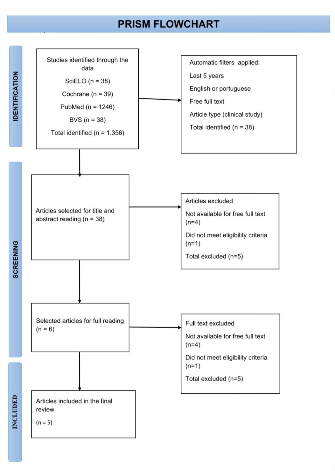 O fluxograma PRISMA (Figura 1) foi elaborado para demonstrar o processo de identificação, triagem, elegibilidade e inclusão dos estudos nas bases de dados utilizadas. As buscas foram realizadas na BVS, PubMed, Cochrane Library e SciELO, aplicando descritores relacionados ao uso da bandagem neuromuscular no linfedema pós-operatório de mastectomia. Na BVS, utilizando a estratégia Kinesio tape AND lymphedema, foram identificados 33 estudos. Após aplicar os filtros de últimos 5 anos, idioma inglês e texto completo gratuito, restaram 4 estudos, dos quais 2 foram selecionados para leitura, resultando na inclusão de 2 estudos na revisão. Na PubMed, a segunda estratégia de busca mais ampla identificou 1.246 estudos. Após a aplicação dos filtros (últimos 5 anos = 512; idioma = 407; texto gratuito = 182; tipo de artigo = 9), 3 estudos foram selecionados para leitura, e 1 estudo foi incluído. Na Cochrane Library, a busca com o descritor Kinesio tape AND lymphedema resultou em 39 estudos. Com a aplicação dos filtros, permaneceram 22 estudos, dos quais 3 foram elegíveis para leitura completa, resultando na inclusão de 1 estudo. Na SciELO, a estratégia Lymphedema AND mastectomy retornou 38 estudos. Após os filtros, restaram 3 estudos, dos quais 2 foram selecionados para leitura, resultando na inclusão de 1 estudo. Ao final do processo de triagem e elegibilidade nas quatro bases de dados, foram incluídos 5 estudos na revisão sistemática, conforme demonstrado na Figura 1.