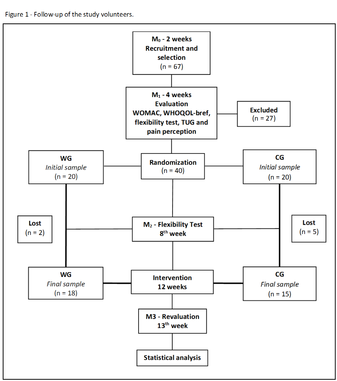 This study consisted of a two-arm parallel randomized controlled therapeutic clinical trial involving elderly volunteers diagnosed with knee osteoarthritis. The project was approved by the Research Ethics Committee of the Universidade do Sagrado Coração (approval number 1,131,248), and all participants signed the Free and Informed Consent Form prior to data collection. The study protocol was registered in the Brazilian Registry of Clinical Trials (ReBec) under registration number RBR-78h48d. Data collection was carried out at the Physical Therapy Research Laboratory, and the intervention program took place at the Therapeutic Pools Laboratory of the Universidade do Sagrado Coração, in Bauru, São Paulo, Brazil. Elderly individuals of both sexes with unilateral and/or bilateral knee osteoarthritis classified as moderate, severe, or very severe according to Lequesne’s algofunctional questionnaire were included. Exclusion criteria comprised unstable heart conditions, inability to ambulate, knee or hip arthroplasty, epilepsy, fibromyalgia, or any contraindication to aquatic therapy. Sample size calculation was performed using the G*Power software, considering an alpha level of 5% and a beta of 80%, resulting in 15 participants per group, with pain intensity used as the primary variable for calculation. A total of 67 individuals were screened, and 27 were excluded. The random allocation of the 40 eligible participants was performed using The Hat®️ 3.0.2 software, and they were divided into a water group (WG; n = 20), which underwent the intervention, and a control group (CG; n = 20), which did not receive any intervention. The evaluative instruments included the WHOQOL-BREF questionnaire, composed of 26 questions distributed across physical, psychological, social, and environmental domains, and the WOMAC questionnaire, a specific instrument for knee osteoarthritis divided into three domains: pain (5 items), joint stiffness (2 items), and physical function (17 items), scored using a Likert scale ranging from 0 to 100 points. Pain perception was assessed using a dolorimeter (Palpeter®️) with 1 kg precision, applying pressure to four predefined anatomical points of the knee, followed by pain measurement using the Visual Analog Scale (VAS). Functional mobility was evaluated using the Timed Up and Go (TUG) test, and flexibility was assessed using the sit-and-reach test; both were performed three times, and the best performance was recorded. The aquatic therapy program lasted 12 weeks, with three 40-minute sessions per week, and water temperature maintained at 33°C. The study design was structured into four stages: M0 – recruitment and selection (two weeks); M1 – baseline evaluation (four weeks); M2 – intermediate reassessment with the sit-and-reach test (eighth week); and M3 – revaluation (thirteenth week), as shown in Figure 1.
