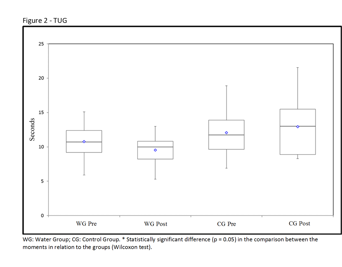 As seen in Figure 2, there was a statistically significant improvement in the TUG test from the WG pre- moment of 10.70 (5.90 to 15.10) seconds to the post- moment of 10.0 (5.30 to 13.0) seconds, with a 6.5% improvement in dynamic equilibrium