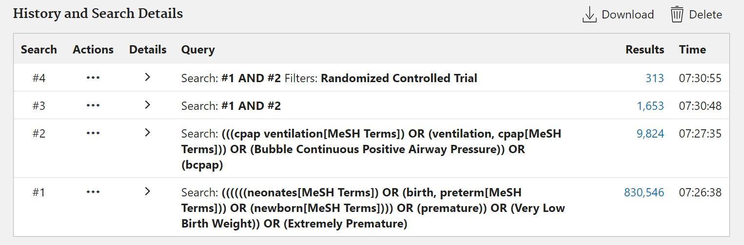 Para a busca dos artigos, foram utilizadas as palavras-chave obtidas nos Descritores de Ciências da Saúde (DeCS): Continuous Positive Airway Pressure, Bubble Continuous Positive Airway Pressure, Newborn, Neonates, Infant, Premature, Very Low Birth Weight, Extremely Premature. Utilizado também as seguintes associações com os operadores boleanos “AND” e “OR”, como conectivos para se realizar a pesquisas: