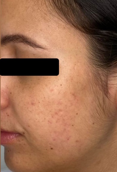 Cinco dias após a terceira sessão, a pele apresentou melhora global do aspecto cutâneo, com maior homogeneidade do tom e textura mais uniforme em comparação ao início do protocolo. Dez dias após a última intervenção, observou-se redução das cicatrizes atróficas, caracterizada principalmente pela suavização do relevo e diminuição do contraste em relação à pele adjacente, mantendo-se a pele com aspecto mais claro, macio e homogêneo.