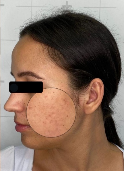 Uma mulher de 22 anos, solteira e estudante, diagnosticada com cicatrizes atróficas de acne na região malar bilateral (Figura 1 e 2), de grau moderado, de acordo com a classificação qualitativa de Goodman & Baron (2006) [14], foi selecionada para participar do estudo sobre microagulhamento associado a um dermoconstrutor com agentes naturais na regeneração de cicatrizes de acne.