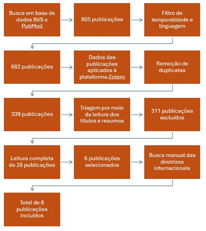 A estratégia de busca identificou inicialmente o total de 805 registros, após aplicar os filtros de tempo e linguagens, ficaram 682 registros nas bases consultadas. Após a remoção de 343 registros duplicados, por meio da plataforma Zotero, permaneceram 339 estudos para triagem por meio da leitura de títulos e resumos. Nessa etapa, 311 publicações foram excluídas por não atenderem aos critérios de elegibilidade. Vinte e oito artigos foram selecionados para leitura completa, dos quais seis atenderam integralmente aos critérios de inclusão e compuseram a amostra final proveniente das bases eletrônicas (Fluxograma 1). Adicionalmente, duas diretrizes clínicas relevantes foram incluídas por meio de busca manual e análise das listas de referências, totalizando oito estudos incluídos na análise final.