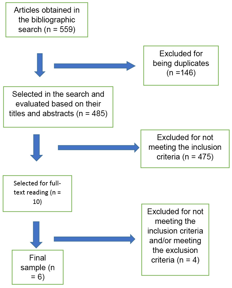 According to the established criteria, the database search yielded 32 articles in MEDLINE/PubMed, no articles in LILACS, 125 articles in EMBASE, 331 articles in Scopus, and 71 articles in Web of Science – totaling 559 articles, of which 146 were duplicates. After applying the inclusion and exclusion criteria, six articles were selected for inclusion in the study (Figure 1).