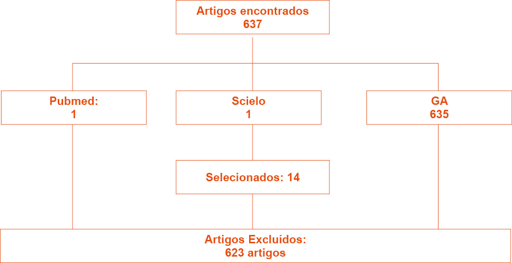Foram considerados critérios de exclusão trabalhos que não abordassem essas informações e que não fossem direcionados a essa temática. Em seguida, foram realizados os seguintes passos: leitura exploratória, seleção do material que contemplasse o objetivo deste estudo, análise e interpretação dos textos selecionados e, finalmente, a redação do artigo. A busca bibliográfica foi realizada na pergunta da pesquisa: A nutrição do recém-nascido pré-termo pode gerar riscos e influenciar no desenvolvimento enquanto interno na UTI neonatal? Quais as evidências científicas em relação à nutrição e no desenvolvimento neonatal? O resultado inicial da busca nas bases de dados e no Google Acadêmico resultou em seiscentos e trinta e sete, sendo um da PubMed, um da Scielo e seiscentos e trinta e cinco do Google Acadêmico (GA). Para a análise e compreensão do conteúdo dos artigos, foram aplicados os critérios de inclusão e exclusão. Em seguida, foram lidos e analisados títulos e resumos dos artigos, dois quais foram excluídos seiscentos e vinte e três. Por fim, foram selecionados quatorze artigos relevantes para o estudo, de acordo com o fluxograma abaixo.