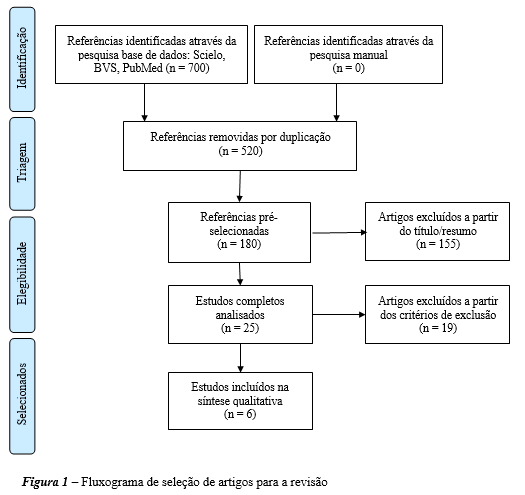 No momento da busca, foram encontrados 59 estudos na base de dados Scielo, 527 estudos na base de dados BVS e 114 na base de dados PubMed. Após a análise de título e resumo, 25 foram selecionados para leitura na íntegra. Após a leitura completa dos 25 estudos e aplicabilidade dos critérios de inclusão e exclusão, 6 artigos foram selecionados. A Figura 1 detalha a elegibilidade dos estudos.