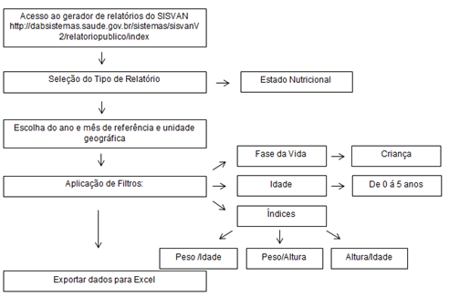Os dados foram coletados através do gerador de relatórios do SISVAN, em seguida foi selecionado o tipo de relatório, aplicado os filtros e por fim os dados para cada Índice foram exportados para Excel, já com a classificação do estado nutricional, conforme a figura 1.