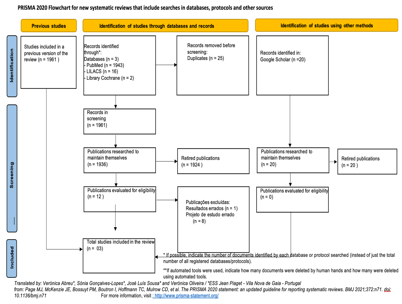 The following databases were used without date limits: Medline (Pubmed), Cochrane Library, LILACS/BVS, a manual search of the references from the studies found in the chosen databases was carried out. We only included articles that were already published in journals. Theses and dissertations were excluded.