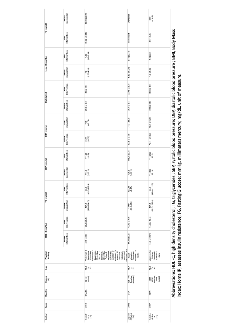 Data extraction was performed by two independent reviewers (P.S.M. and A.G.P.). Disagreements between the two reviewers regarding the conditions of the studies were resolved by a consensus meeting with the third reviewer (B.M.). For data extraction, a standardized form was used, composed of the following items: author, population, intervention data, and outcomes. For each item, the following data were extracted: 1) Population (mean age, and HDL-C; triglycerides; HOMA-IR, Fasting Glucose, systolic blood pressure(SBP); diastolic blood pressure (DBP), Body Mass Index (BMI); 2) Intervention (modality, intervention period, session, and weekly duration, weekly frequency, intensity, number of sets and repetitions); Results (mean values and standard deviation of the pre- and post-intervention, and the difference between the means).