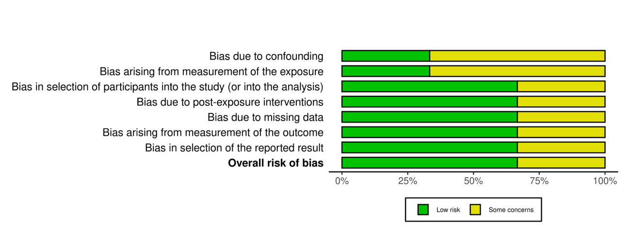 Among the included studies, 66.66% reported a low risk of confounding bias (2 of 3), 66.66% reported a low risk of selection bias (2 of 3),