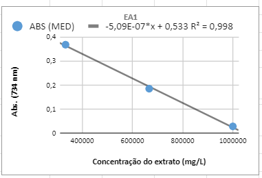 A curva padrão de Trolox, gerada nas concentrações de 100 µM a 1.500 µM, foi obtida a partir dos valores das absorbâncias das diferentes concentrações de Trolox. Os valores da atividade antioxidante foram obtidos a partir da absorbância equivalente a 1.000 µM de Trolox, sendo os resultados expressos em µM Trolox.g-1 [8].