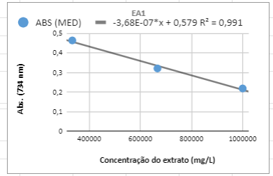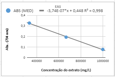 Na análise das garrafadas para a verificação de atividades antioxidante foi utilizado o método de ABTS. Essa atividade é verificada por meio da coloração da solução que se manifesta pelo radical ABTS, observada pelo auxílio do equipamento espectrofotômetro cujo comprimento de onda é de 740 nm [8]. Com a aplicação da espectrometria foi possível chegar aos valores presentes nas amostras das garrafadas que apresentaram atividades antioxidantes.