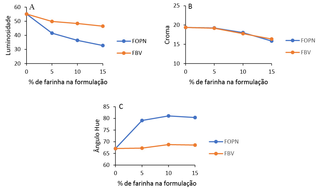 Para fins de discussão dos resultados, será considerado como controle (FC) a formulação elaborada com a farinha mista (75%FS + 25%FM), sem adição de FOPN ou de FBV.