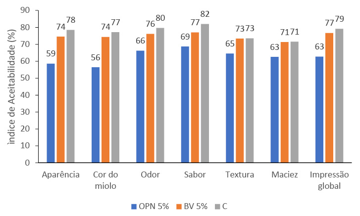 A formulação BV5% apresentou índices de aceitabilidade próximos à FC, em todos os atributos, sugerindo que a substituição parcial da FMI por FBV foi bem-sucedida em manter as características sensoriais do pão (Figura 2). Todos os atributos avaliados (BV5% e FC) apresentaram índice de aceitabilidade maior de 70%, e podem ser classificados como produtos com boa aceitação sensorial [24]. Por outro lado, a formulação OPN5% obteve índice de aceitabilidade mais baixo em todos os atributos, indicando que a FOPN pode ter provocado mudanças sensoriais menos apreciadas pelos consumidores.