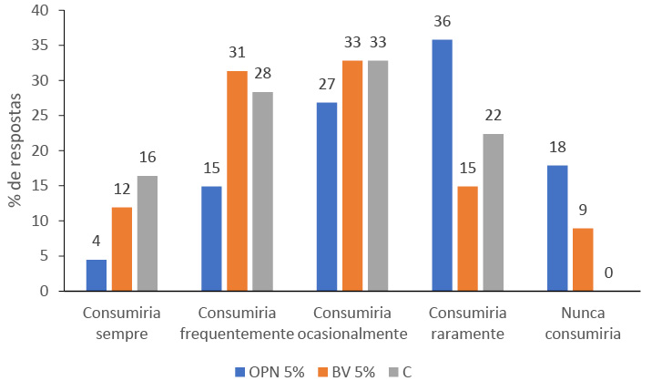 Em relação à intenção de consumo (Figura 3), 36% dos avaliadores consumiriam raramente a formulação OPN5%, e 33% consumiriam FC e BV5% ocasionalmente.