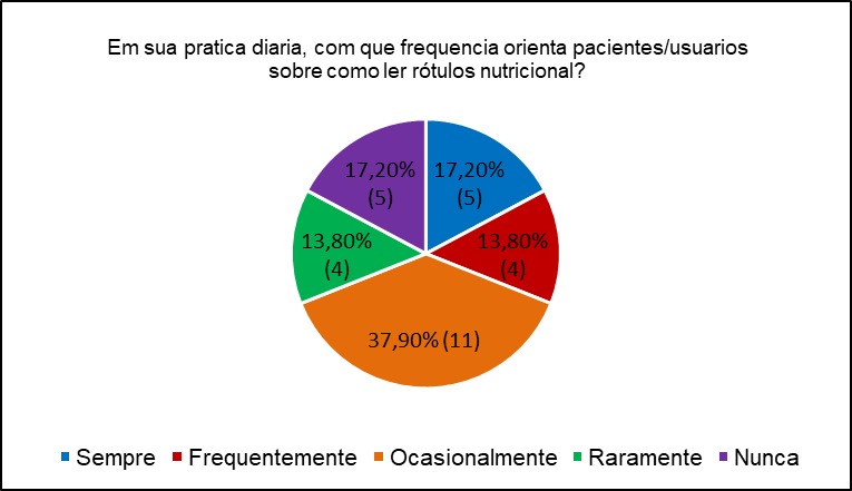 A orientação de seus pacientes/usuários a respeito da leitura de rótulos nutricionais, mostrou que essa ocorre apenas ocasionalmente. Esses dados indicam que a prática de orientar sobre rótulos ainda não está completamente integrada no atendimento rotineiro das UBS. A variação na frequência de orientação também pode refletir diferenças no conhecimento ou confiança dos profissionais em relação ao tema, ressaltando a importância de capacitações específicas para melhorar a compreensão e a habilidade de transmitir. Segundo o Ministério da Saúde [22,17], a rotulagem nutricional é uma ferramenta essencial de saúde pública, pois facilita a escolha de alimentos mais saudáveis pela população, ao mesmo tempo que promove o conhecimento e a autonomia nas decisões alimentares.