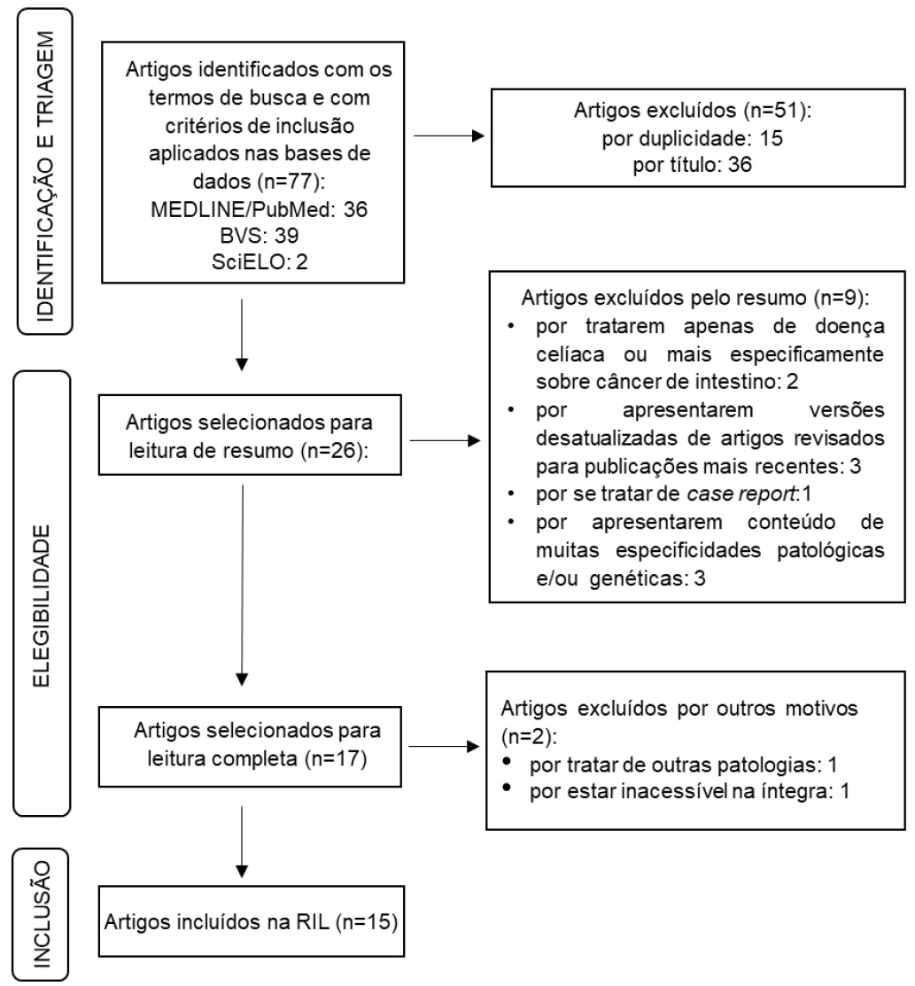 Revisão de literatura para descrever a abordagem nutricional e terapêutica da DCR. A pesquisa foi realizada em 17 e 18 de julho de 2022. Utilizou-se diretrizes e artigos indexados nas seguintes bases de dados: Scientific Electronic Library Online (SciELO), Biblioteca Virtual em Saúde (BVS) e National Library of Medicine (MEDLINE/PubMed). Os descritores utilizados foram “doença celíaca”, “dieta livre de glúten” e “glutens” e seus correspondentes em inglês, “celiac disease”, “gluten-free diet”, “glutens” e em espanhol, “enfermedad celíaca”, “dieta sin gluten” e “glútenes”, valendo-se da técnica booleana “and”. Foram considerados critérios de elegibilidade para inclusão dos estudos: (i) estudos de revisão, revisão sistemática, ensaios clínicos, metanálises, ensaios controlados randomizados e diretizes que abordassem a DCR; (ii) idiomas espanhol, inglês e português; (iii) publicações entre os anos de 2012 e 2022; (iv) publicações com resumos e texto inteiros disponíveis nas bases selecionadas. Como critérios de exclusão foram excluídos: (i) artigos repetidos nas bases selecionadas; (ii) estudos que tratassem exclusivamente de outros tipos de DC e/ou doenças relacionadas ao glúten, (iii) estudos que não atendessem aos critérios de inclusão.
