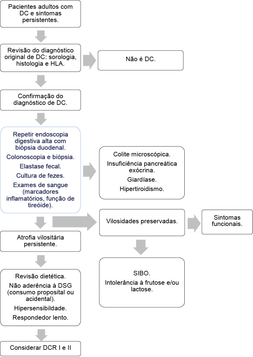 A primeira etapa diagnóstica consiste na detecção de IgG anti-TG2. Se a sorologia for positiva, biópsias duodenais são necessárias para confirmar o diagnóstico. Ademais, recomenda-se o acompanhamento anual por biópsia até a recuperação completa das vilosidades, mesmo em pacientes assintomáticos, vez que a atrofia das vilosidades pode persistir por um longo período (6 meses a 5 anos) em mais de 40% dos pacientes em DSG, e a falta de cicatrização da mucosa tem sido associada ao aumento do risco de complicações, notadamente fraturas ósseas e linfomas. A atrofia persistente das vilosidades intestinais deve induzir a verificação sobre a adesão à DSG e, em caso de adesão estrita, a excluir a DCR [2].