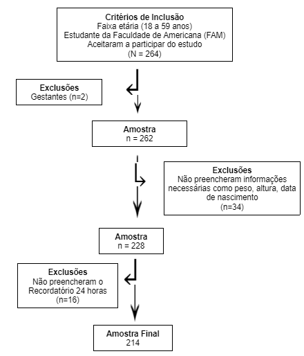Foram entrevistados aproximadamente 264 pessoas, todavia, foram excluídas pessoas que não informaram todas as perguntas presente no questionário, sendo excluídos também participantes que não se enquadraram nos critérios de inclusão e exclusão, resultando assim uma amostra final de 214 participantes, conforme apresentados na figura 1.